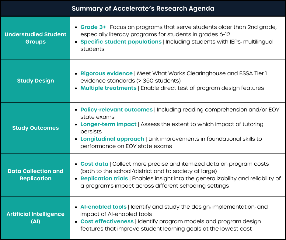 Based on our review of the existing landscape of evidence on tutoring program impact, we created a research agenda that will inform our work.